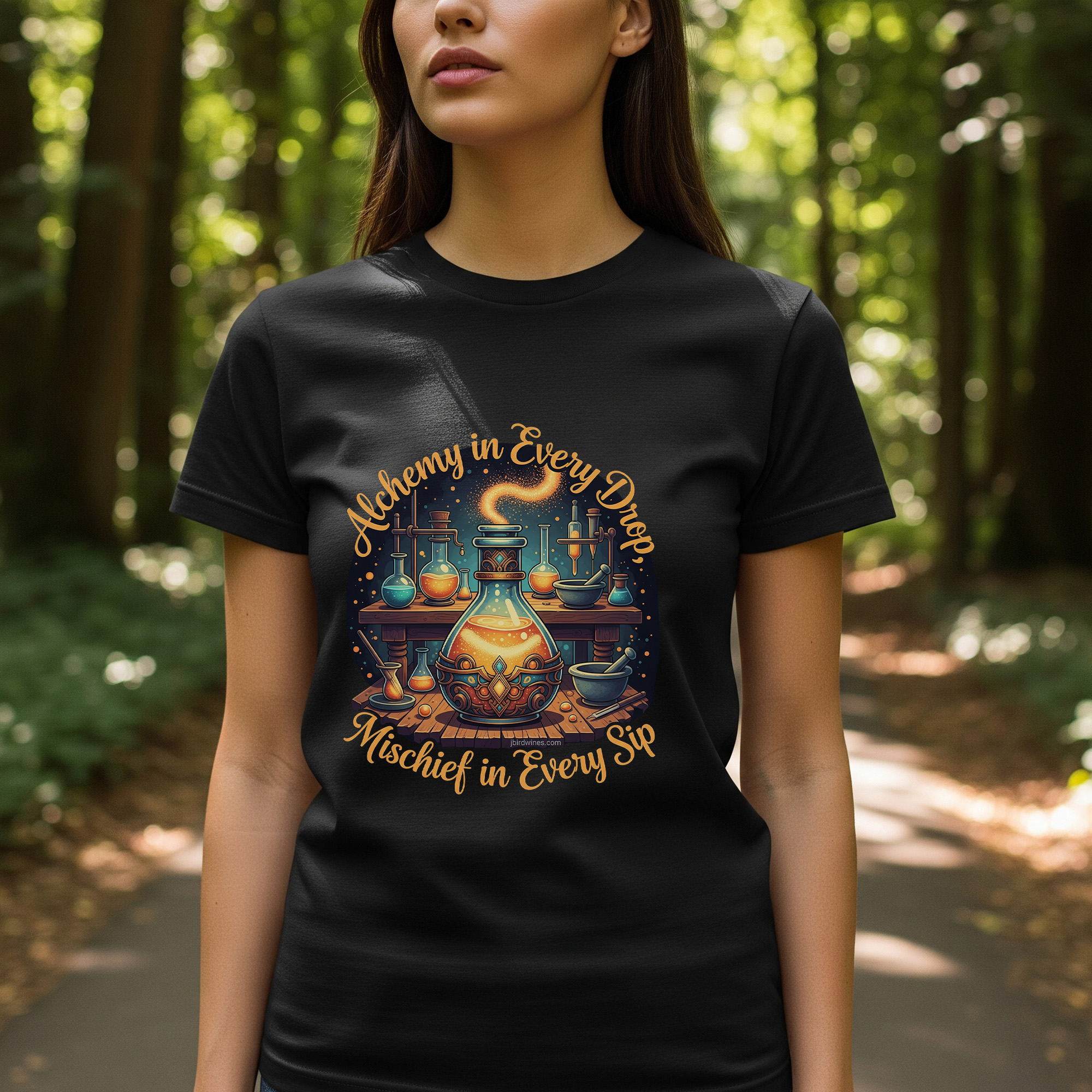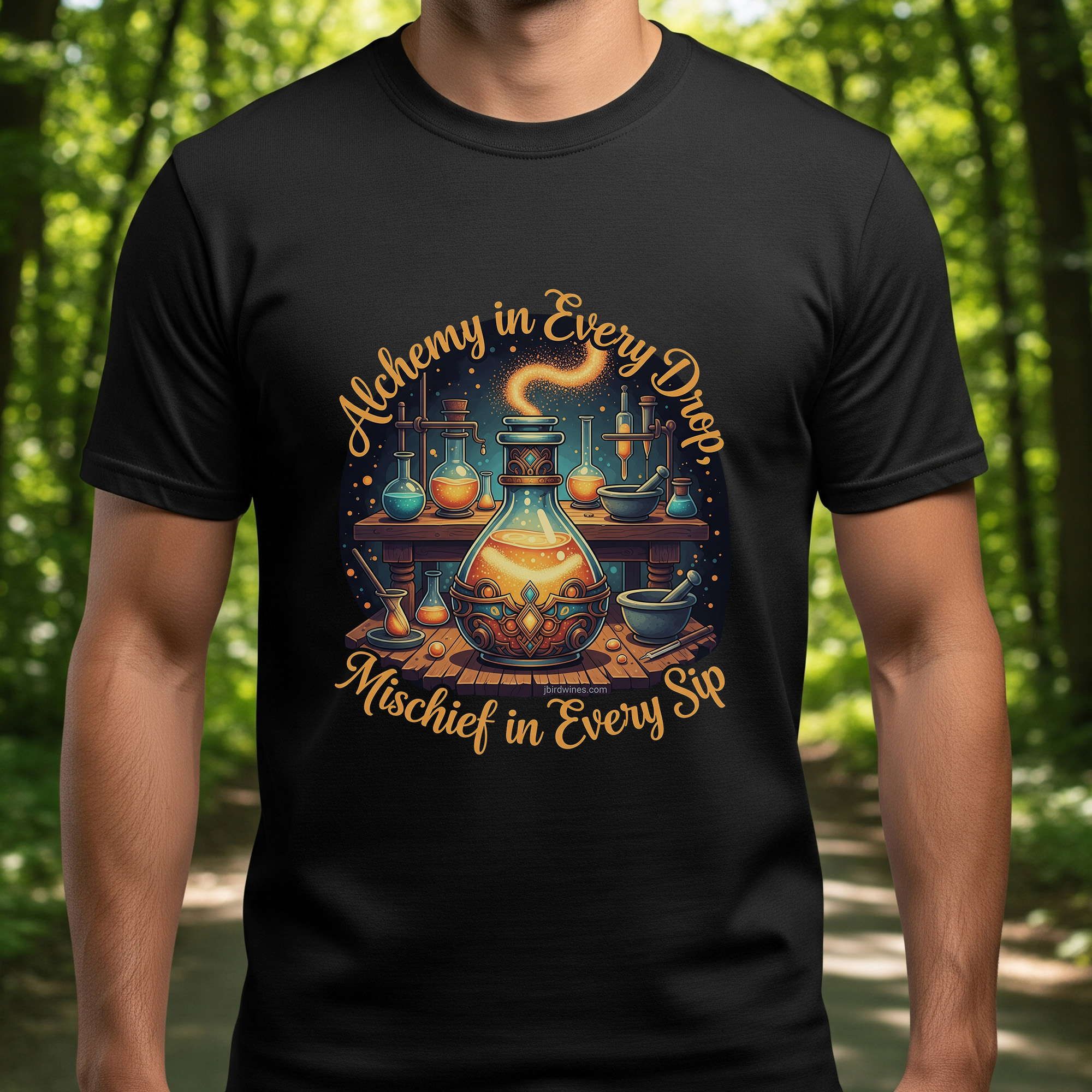 Alchemy In Every Drop, Mischief in Every Sip in a cursive font around the middle design of a magical Alchemy set.