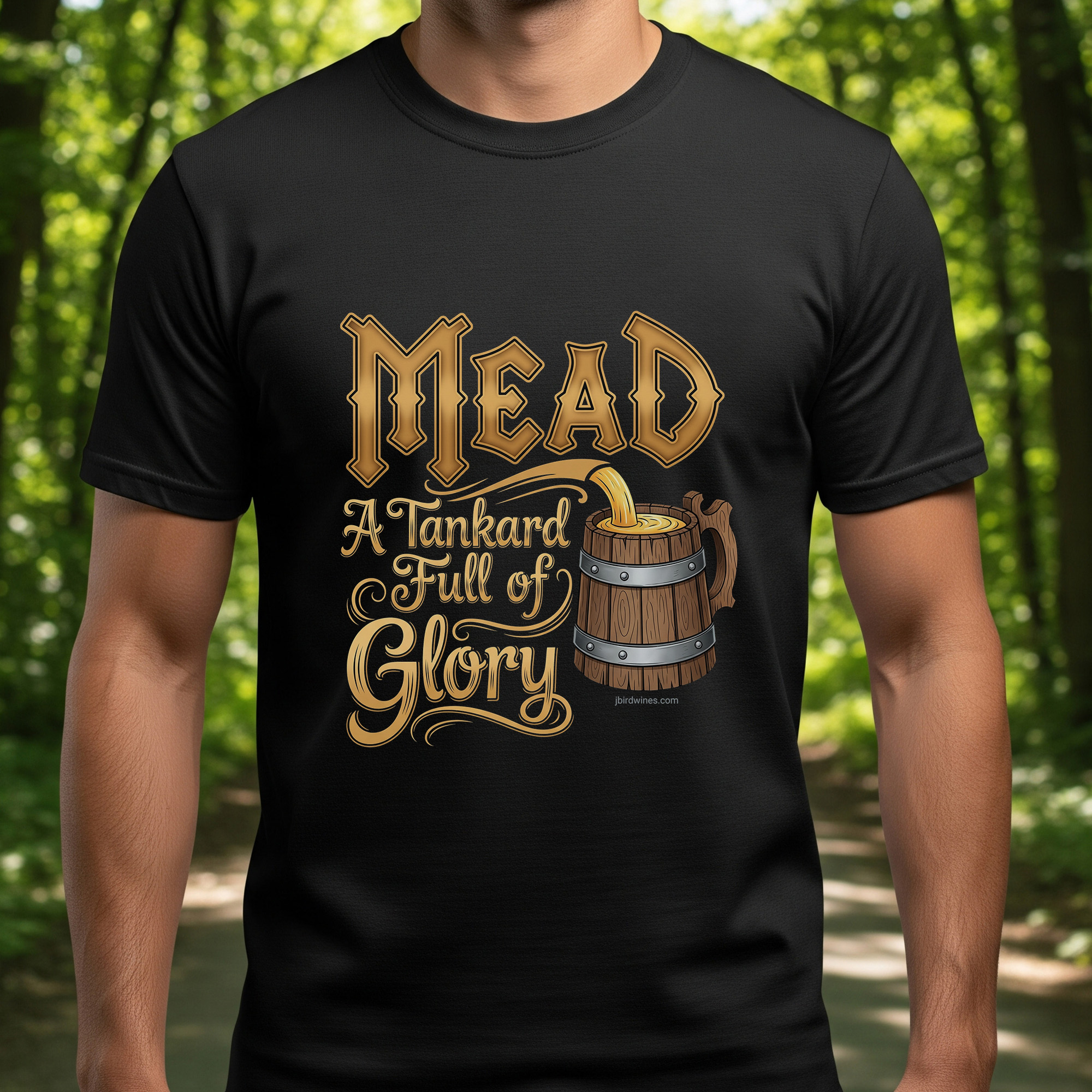 Mead, A Tankard Full of Glory in a bold design with mead being poured into a wooden mug.